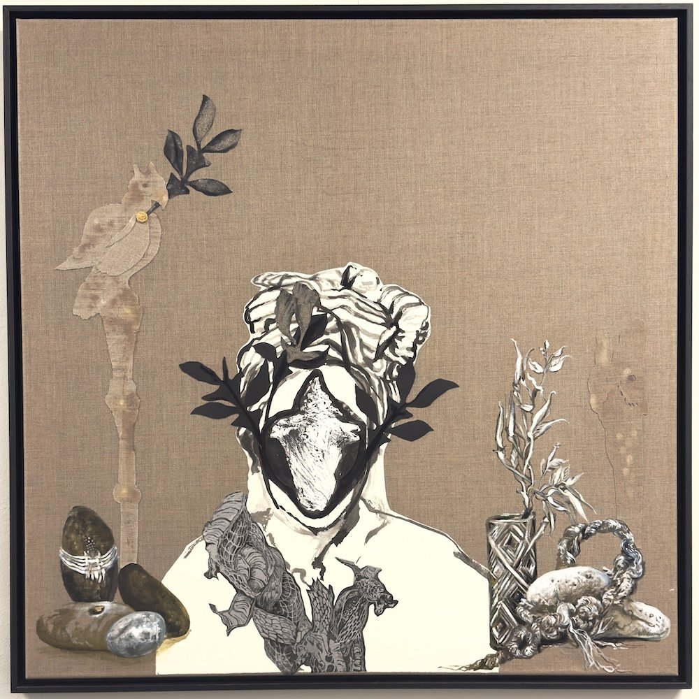 Artwork Caption “Invocation for cosmic re-alignment”. Individuality is disguised to prevent prejudice. Inks on paper and linen, collaged with a glove, cutouts of my prints of snake vertebrae, african and other symbols of peace. The offered olive branch’s paper is stained with tree blood, earths and gold leaf. Incantation for harmony.